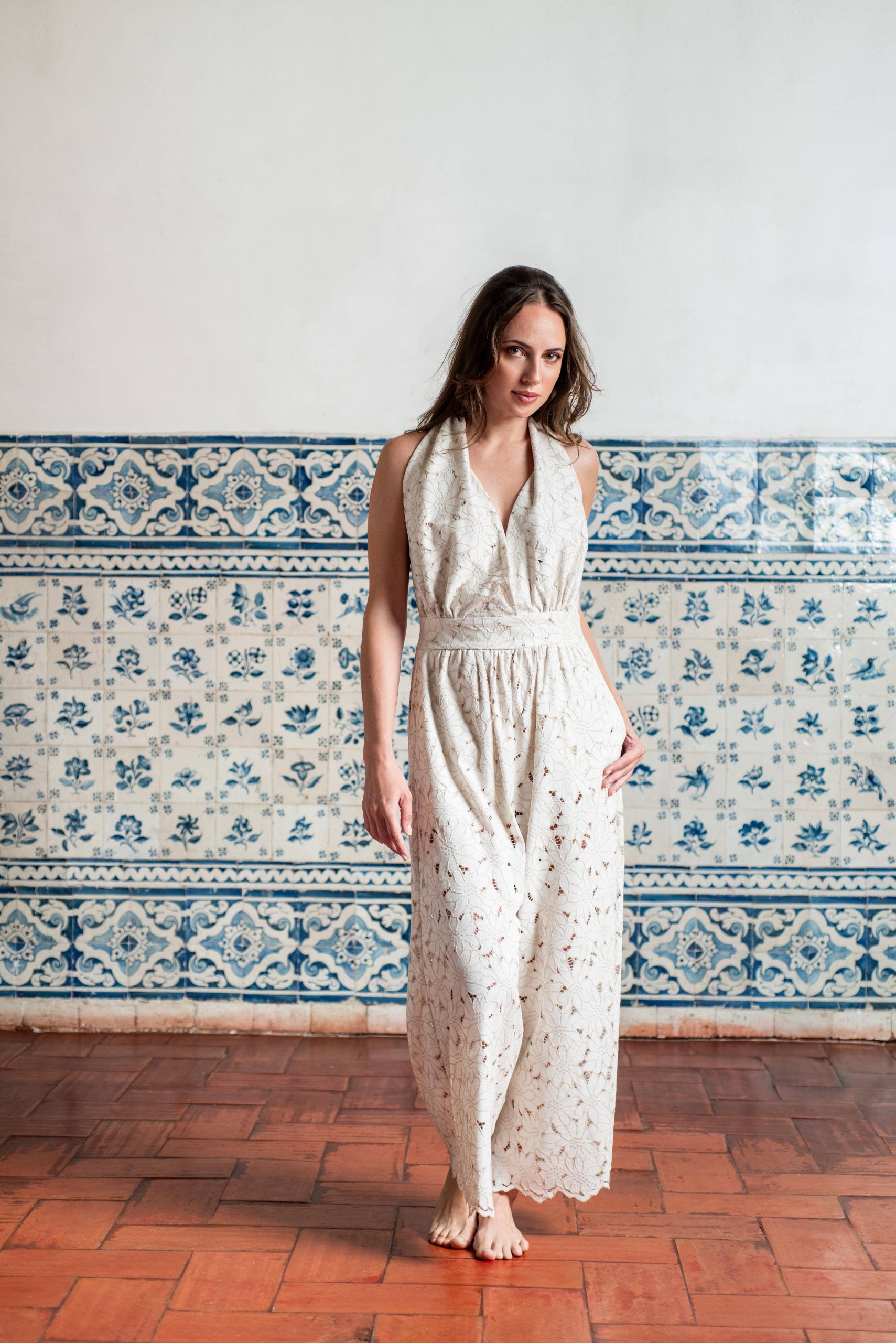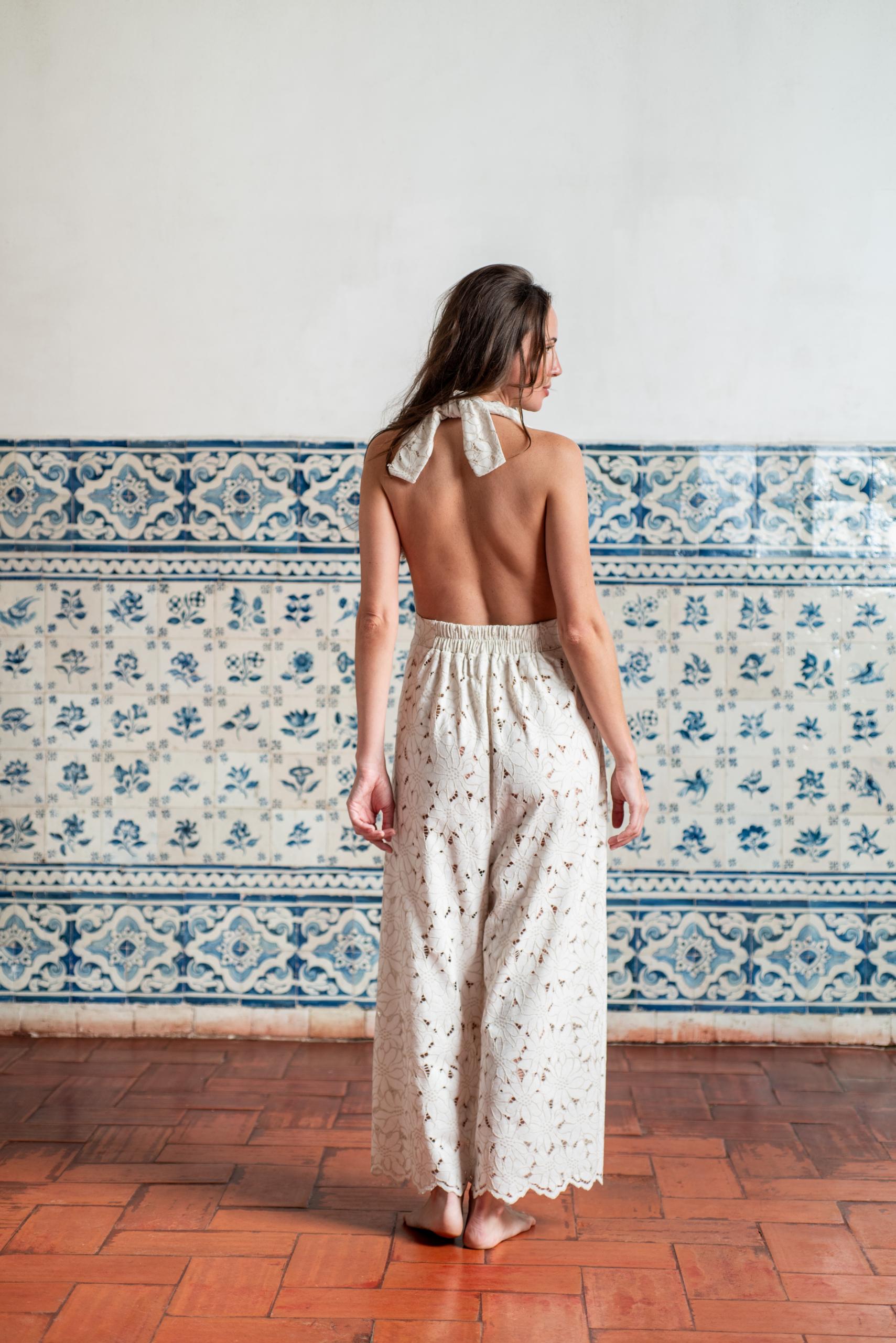 Introducing our chic Flora Maxi Jumpsuit, a fashion essential every woman should have in her wardrobe. Crafted from a unique all-over floral embroidery fabric, its versatile design is perfect for various styling options. Style it up with accessories for a night out or style it down to run errands.