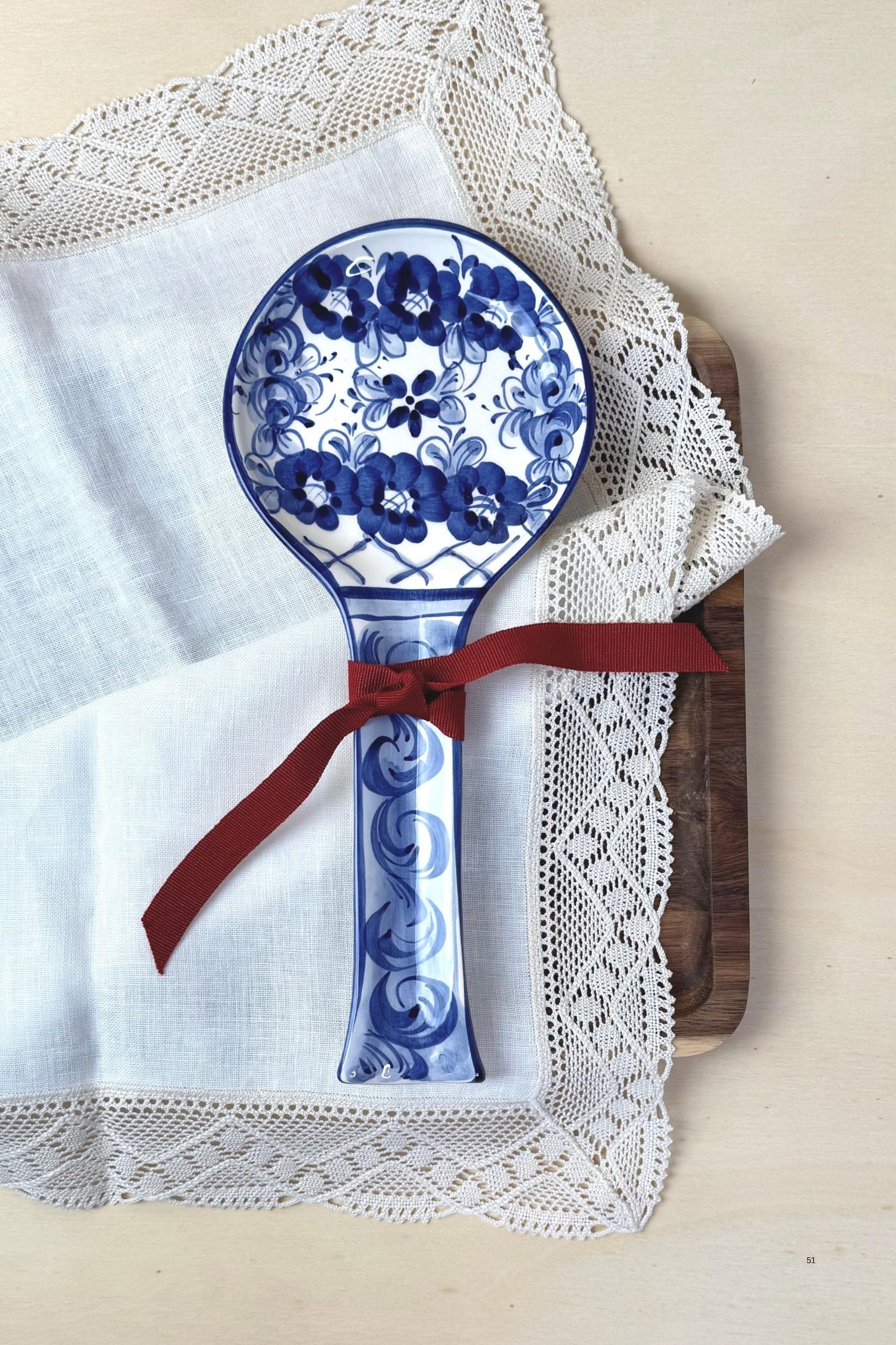 Keep your cooking space neat and organized with this hand painted ceramic spoon rest. Crafted in Portugal with traditional blue floral pattern on an off-white background, this practical piece keeps countertops clean while adding a touch of artisanal elegance to your kitchen. Available in one size only.