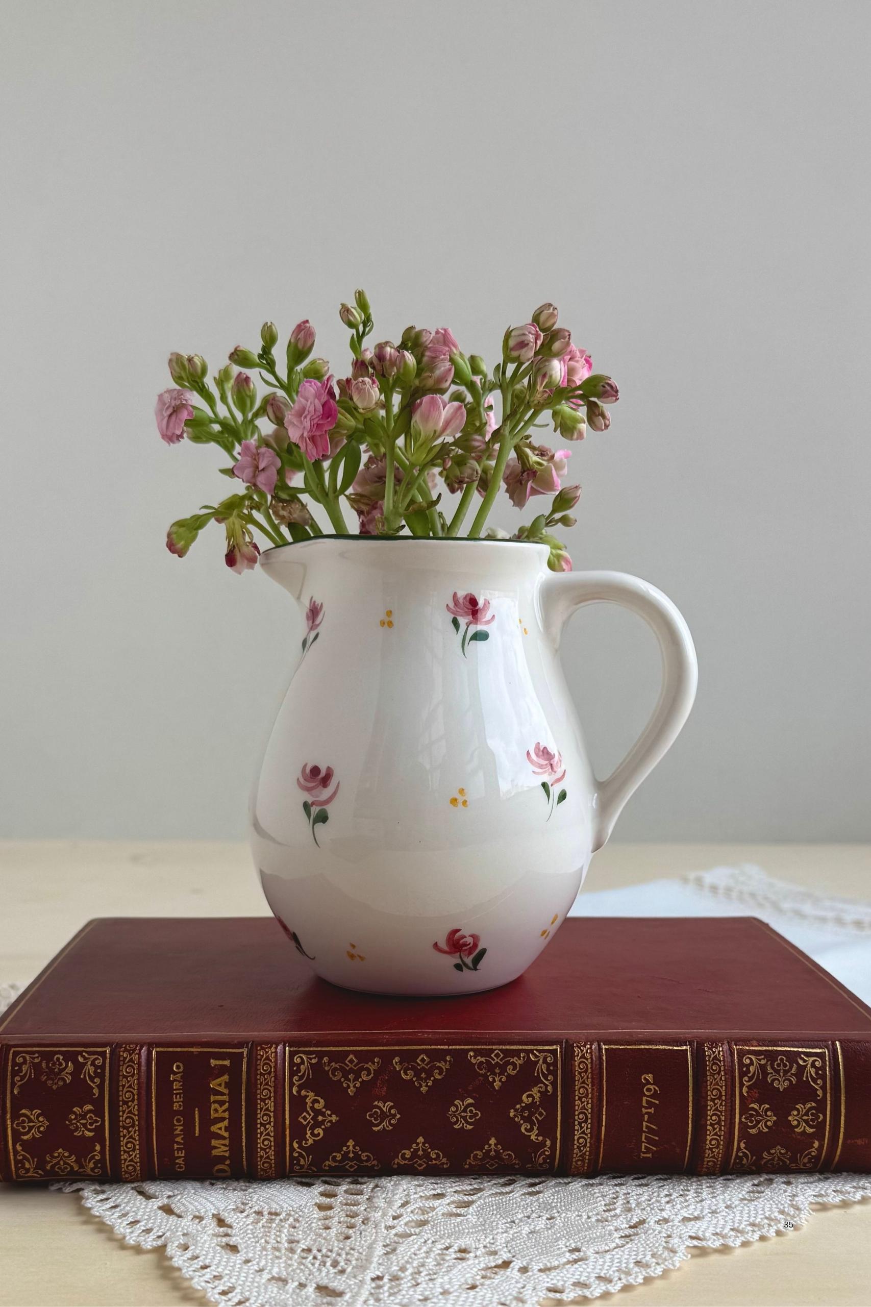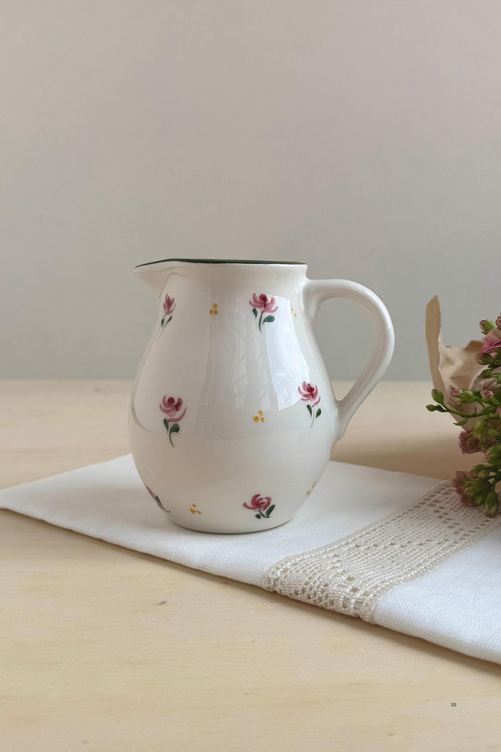 Add a touch of timeless elegance to your table with the Dalia Floral Milk Jug, a handpainted ceramic piece lovingly crafted in Portugal by skilled local artisans. Its romantic floral design, featuring delicate pink and green motifs, brings beauty and charm to every pour—whether serving milk, cream, or even fresh juice. Versatile and decorative, it also doubles beautifully as a small flower vase, adding natural charm to your kitchen, dining table, or home décor. More than just tableware, this jug is a true celebration of Portuguese artistry.