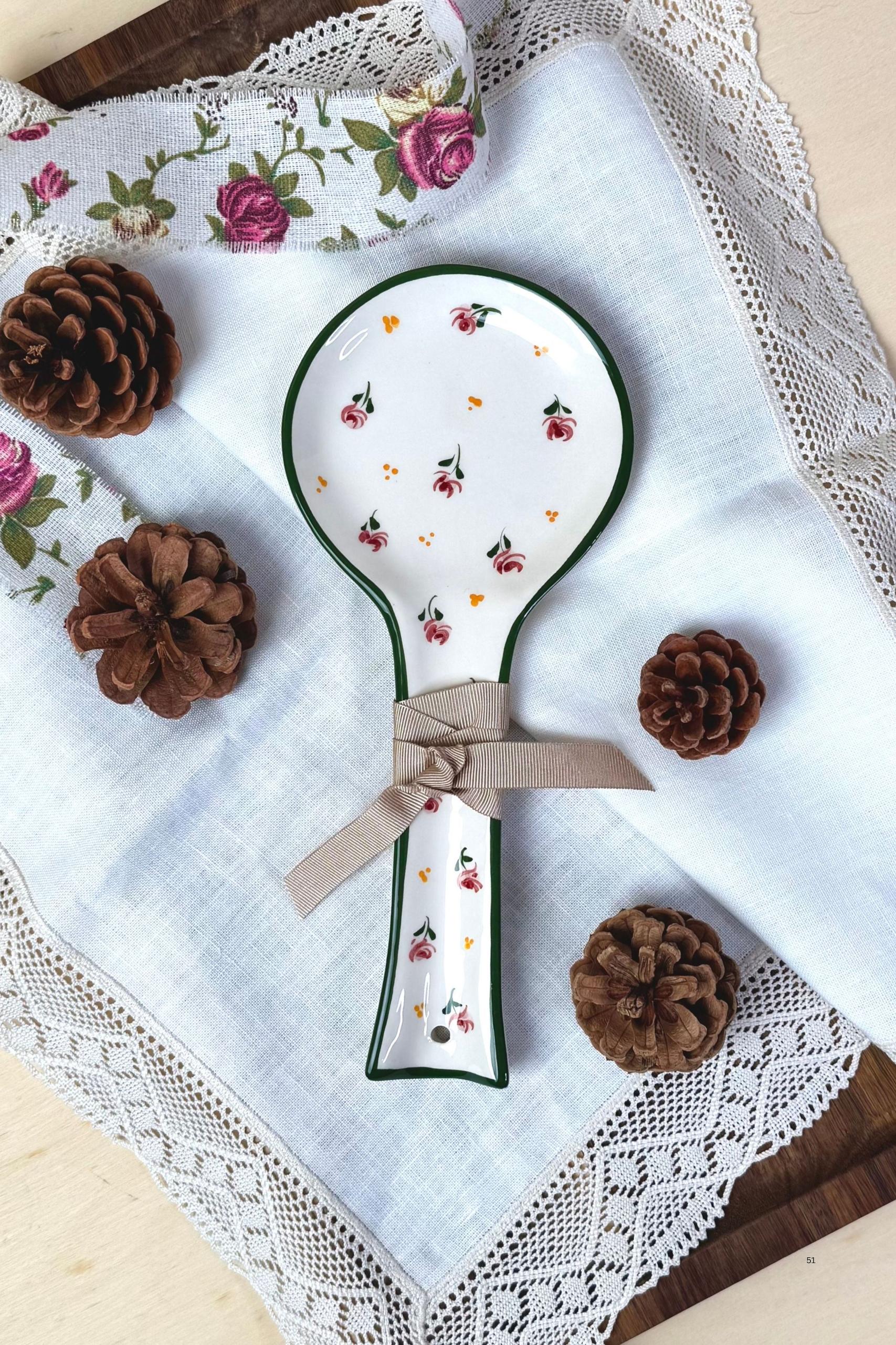 Hand-painted in Portugal, the Dalia Floral Spoon Rest combines function with timeless beauty. Featuring delicate pink and green floral motifs, this romantic piece keeps countertops clean while adding a touch of vintage charm to your kitchen. Rooted in Portugal’s rich ceramic tradition, it makes a thoughtful gift for home and design lovers alike.