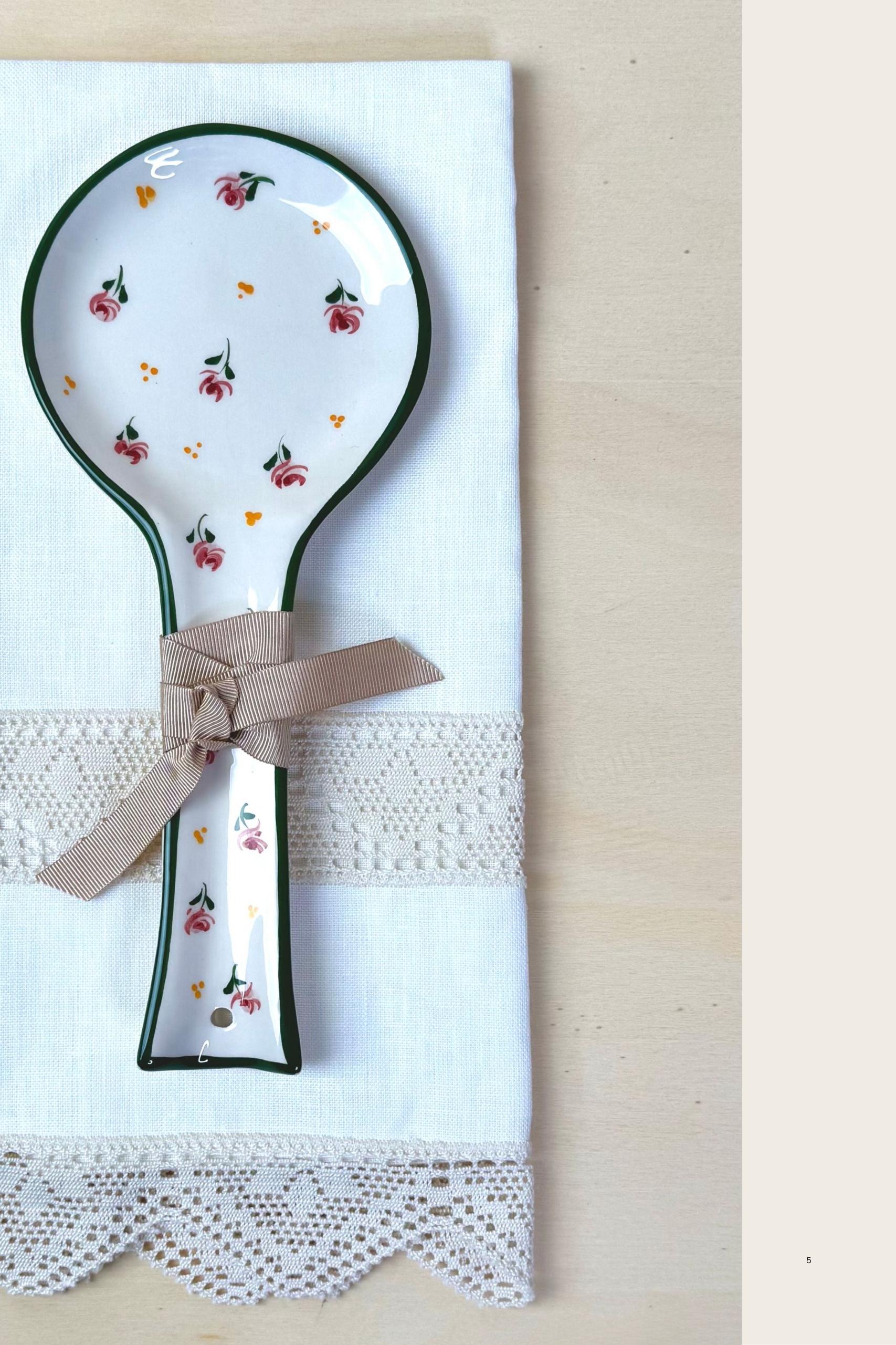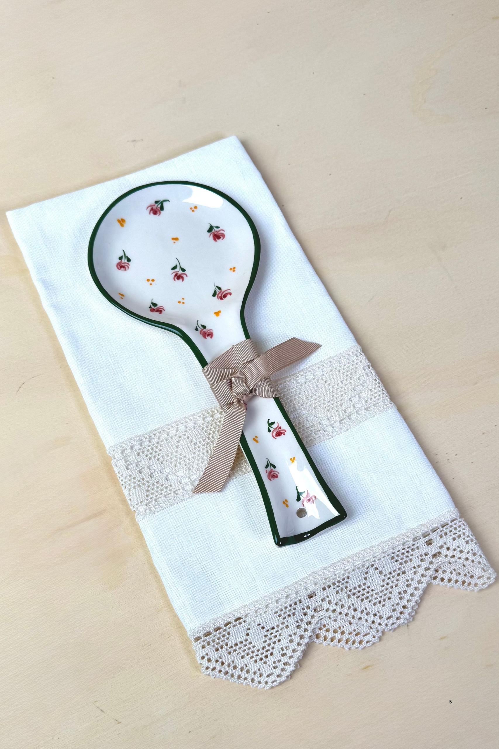 Graceful and refined, the Dalia Gift Set celebrates the art of everyday beauty. The ceramic spoon rest, lovingly hand-painted with soft pink floral motifs, adds a romantic touch to the kitchen while keeping countertops tidy. Paired with a pure linen guest towel adorned with delicate lace trim, this set combines timeless craftsmanship with understated luxury.