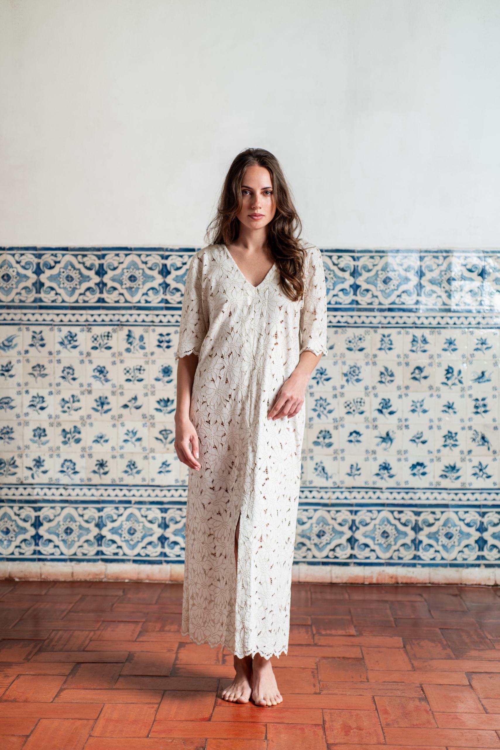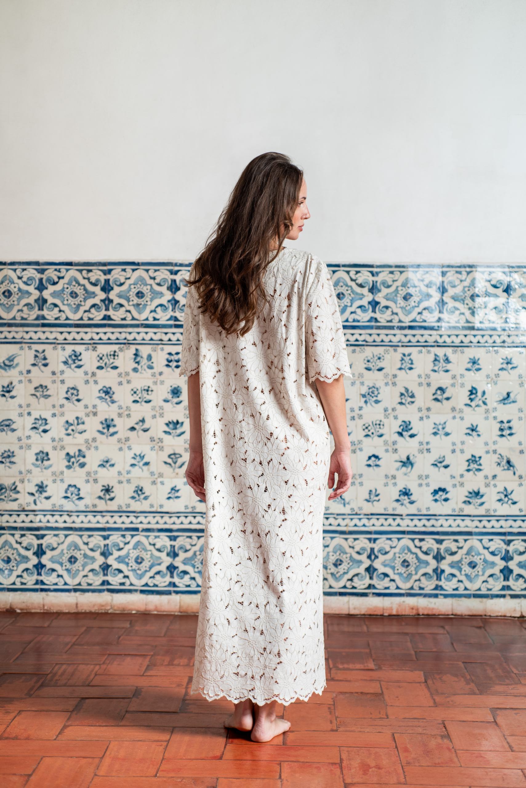 Introducing our timeless kaftan-style maxi dress, a must have addition to any wardrobe. Crafted from a unique all-over floral embroidery fabric, its versatile design allows for various styling options. Wear it comfortably at home or style it up with a waist belt and statement accessories.