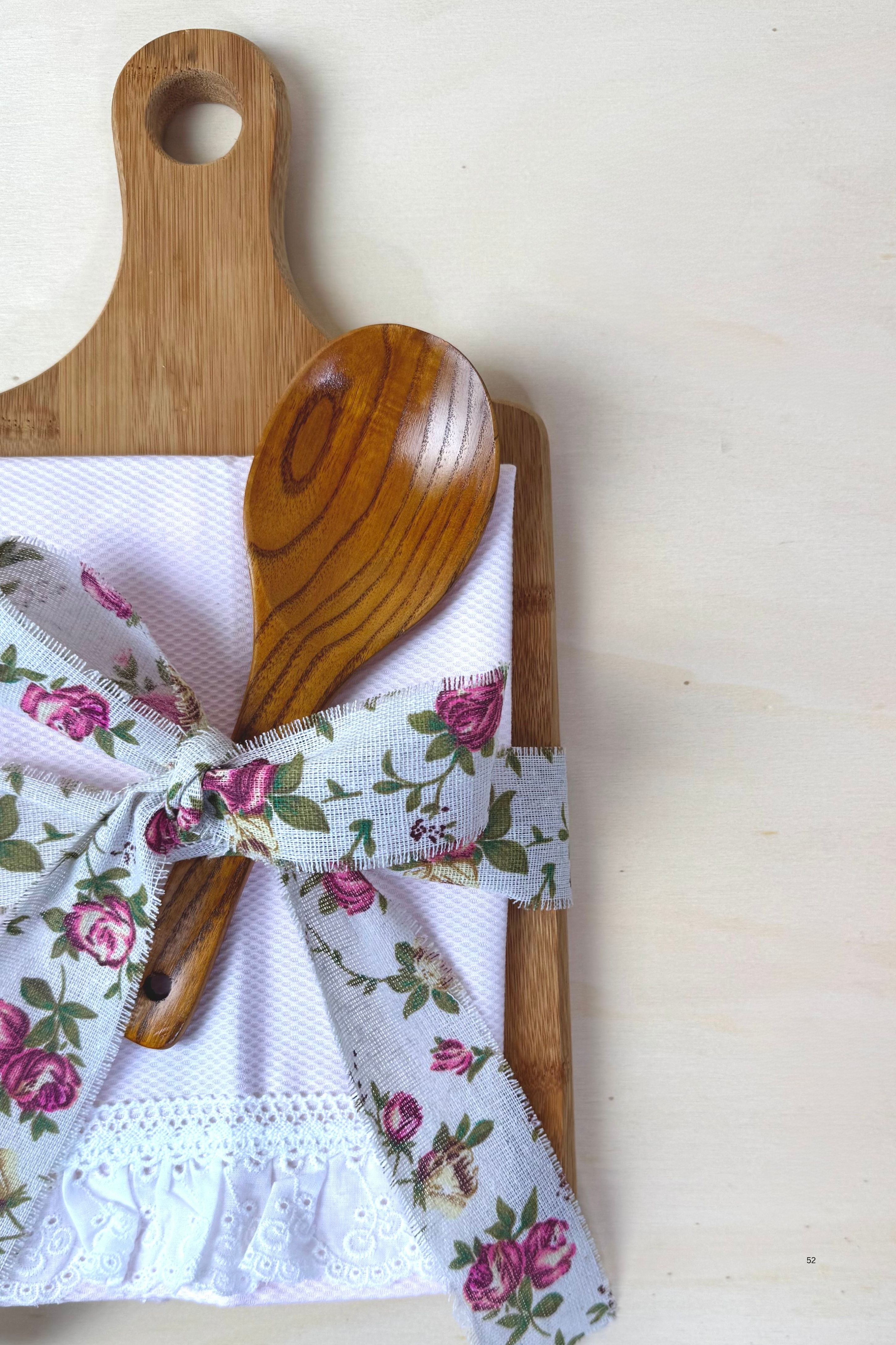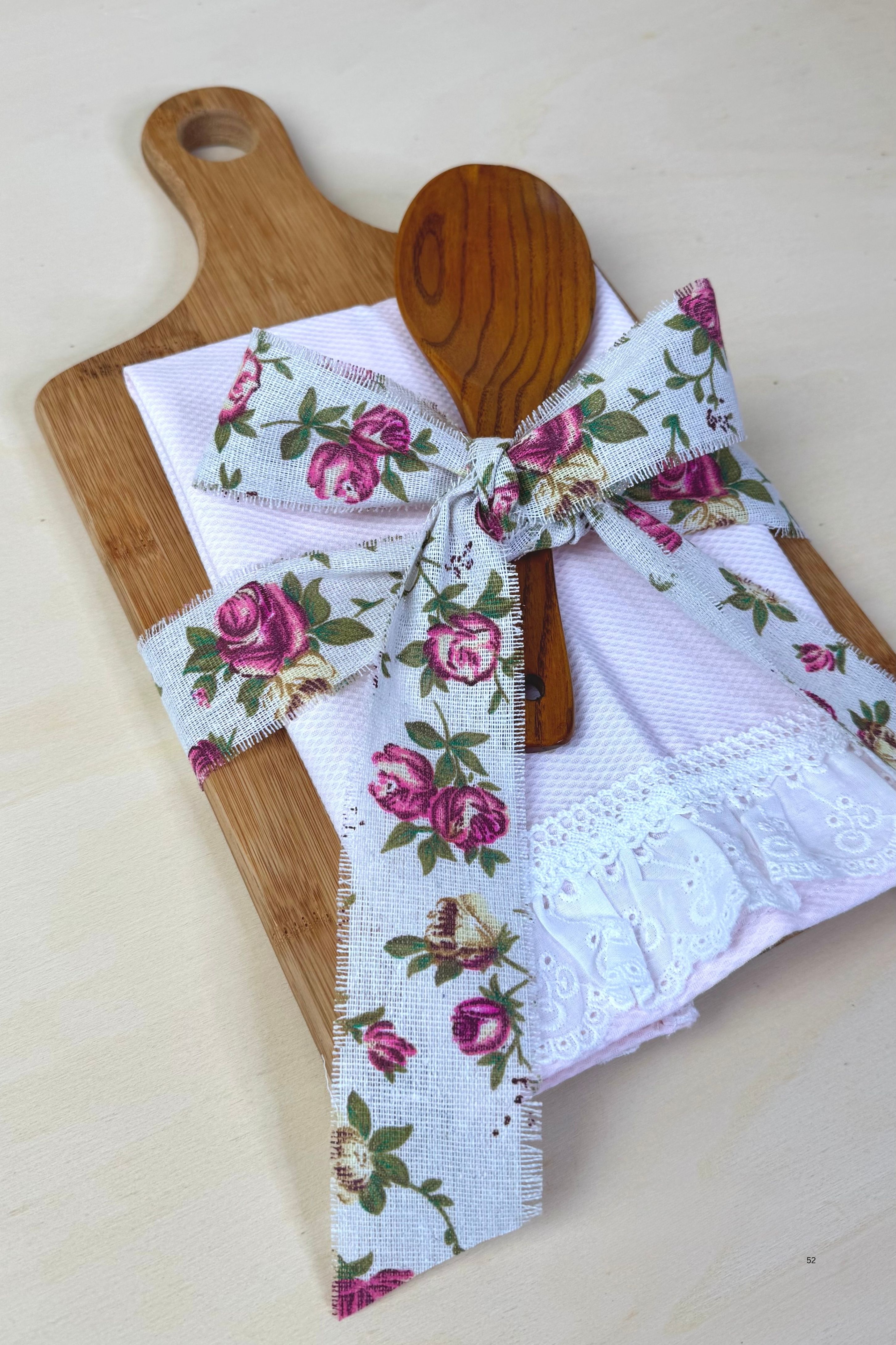 Delight kitchen lovers with this Gift Set Cutting Board & Pink Vintage Towel, featuring a wooden cutting board, classic spoon, and pink lace-trimmed cotton towel tied with a floral bow.