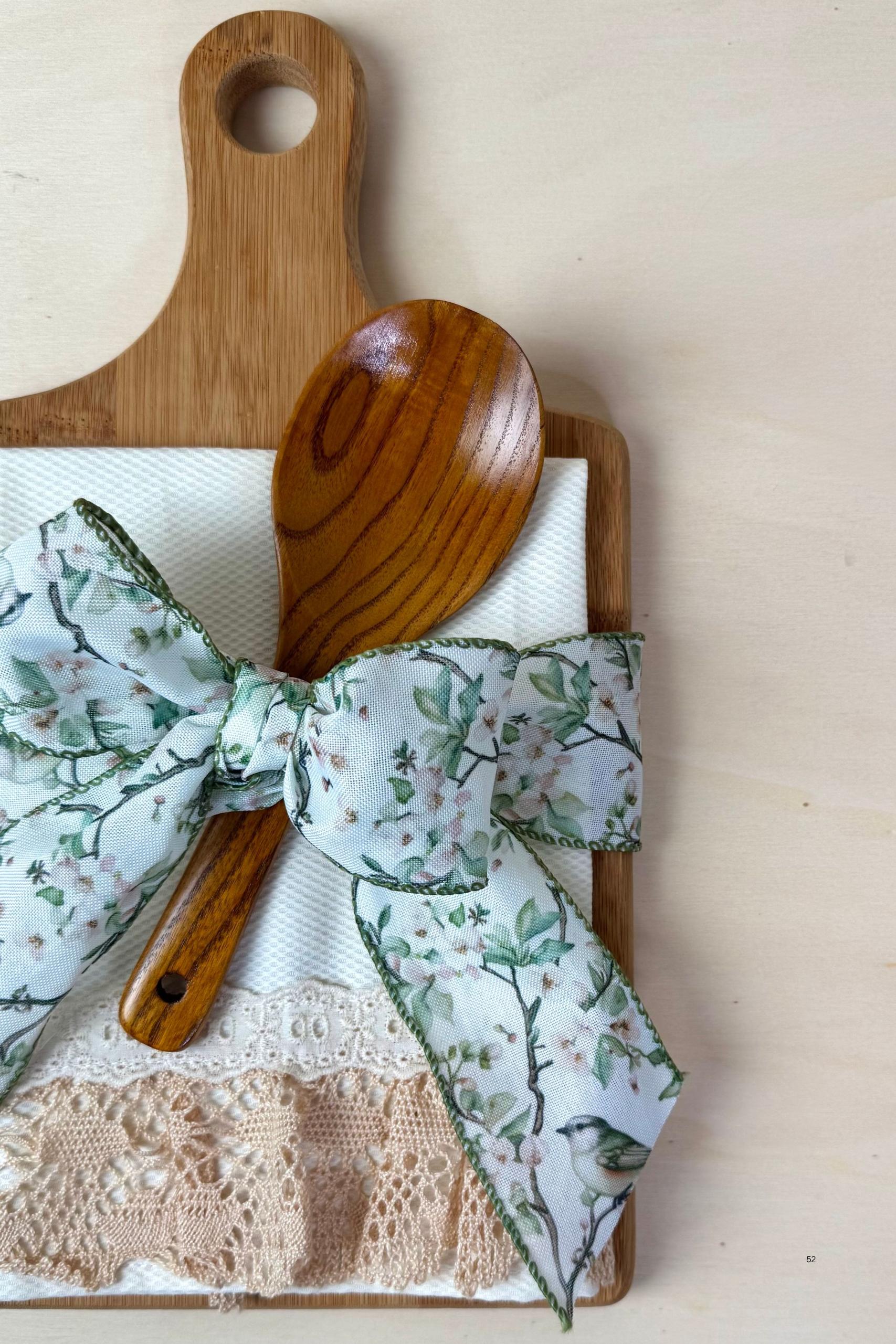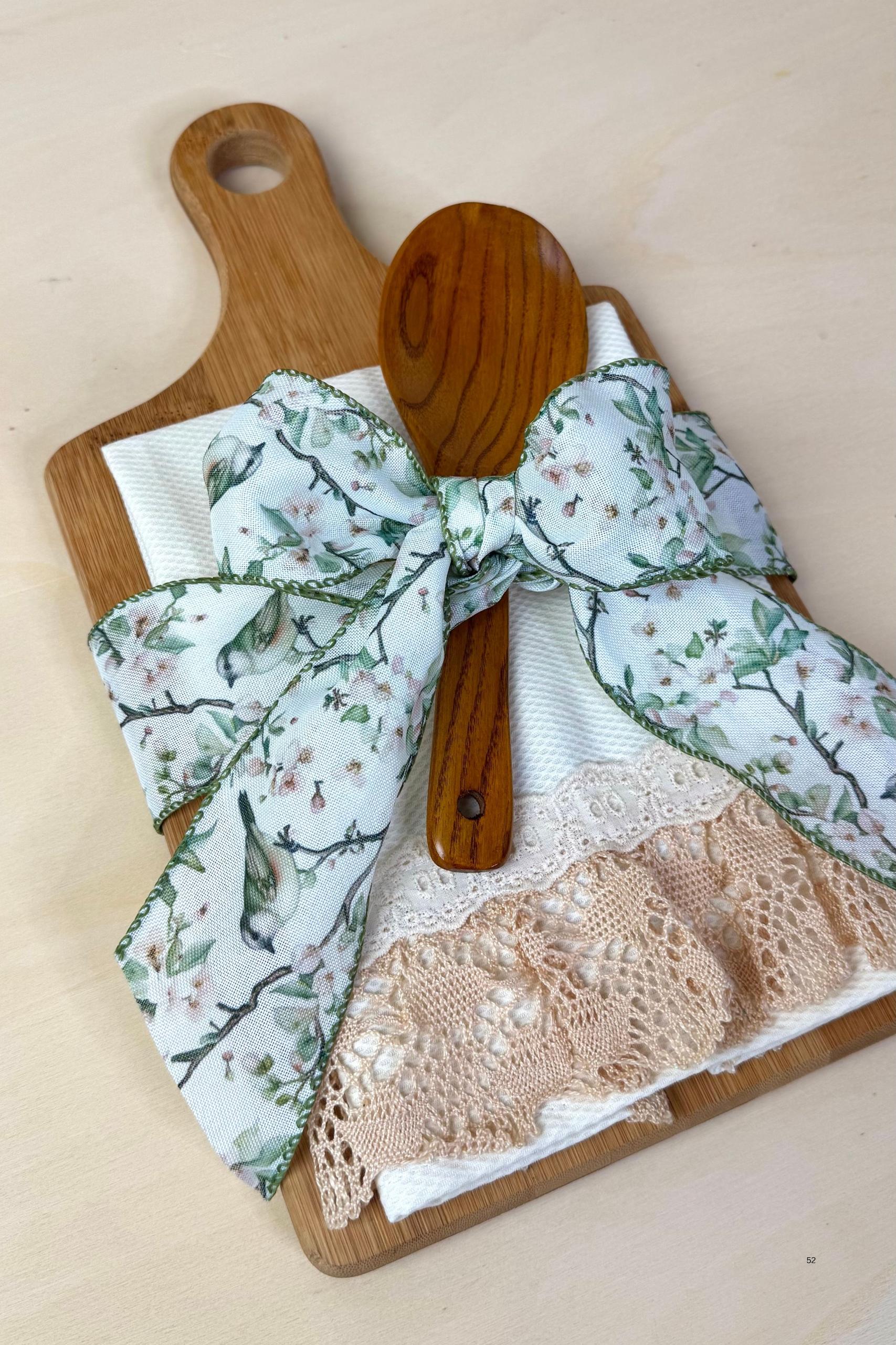 Delight kitchen lovers with this romantic gift set featuring a wooden cutting board, spoon, and cotton waffle towel with vintage-inspired lace, tied with a charming green bow.