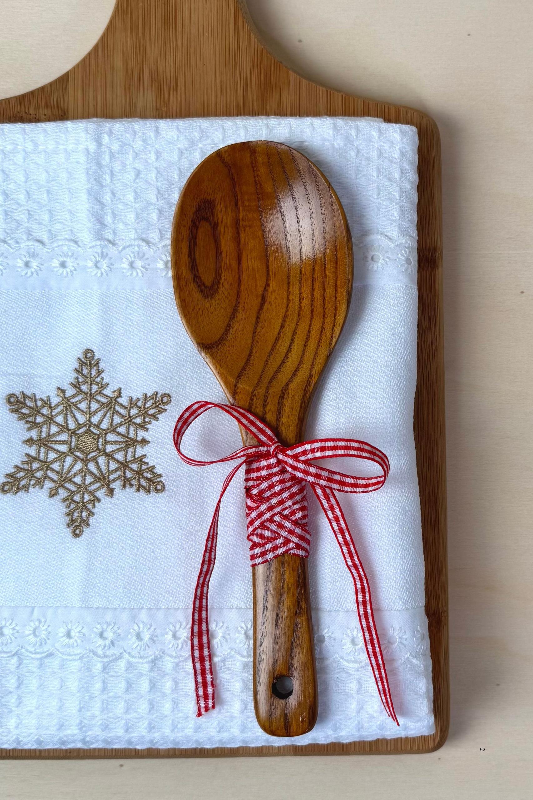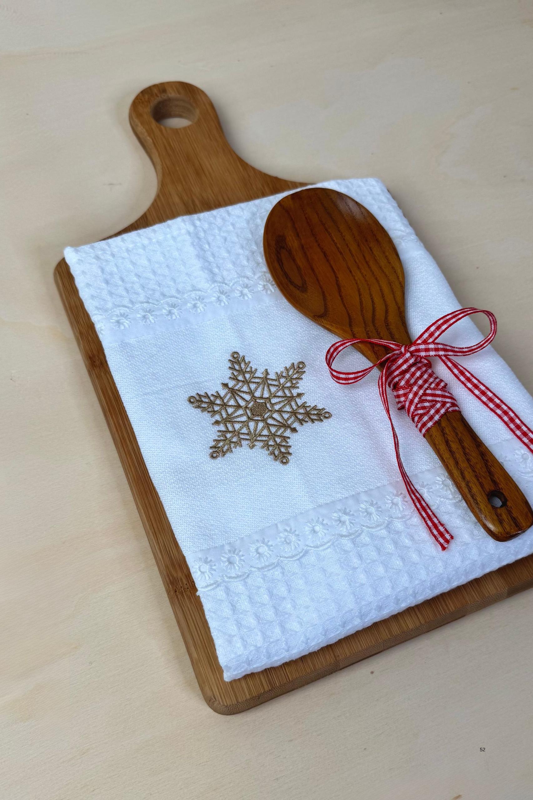 Add a touch of festive elegance to your home this Christmas with this beautifully handcrafted kitchen gift set, featuring a solid wood cutting board & spoon and a cotton kitchen cloth embroidered with a delicate gold Christmas star and lace details .