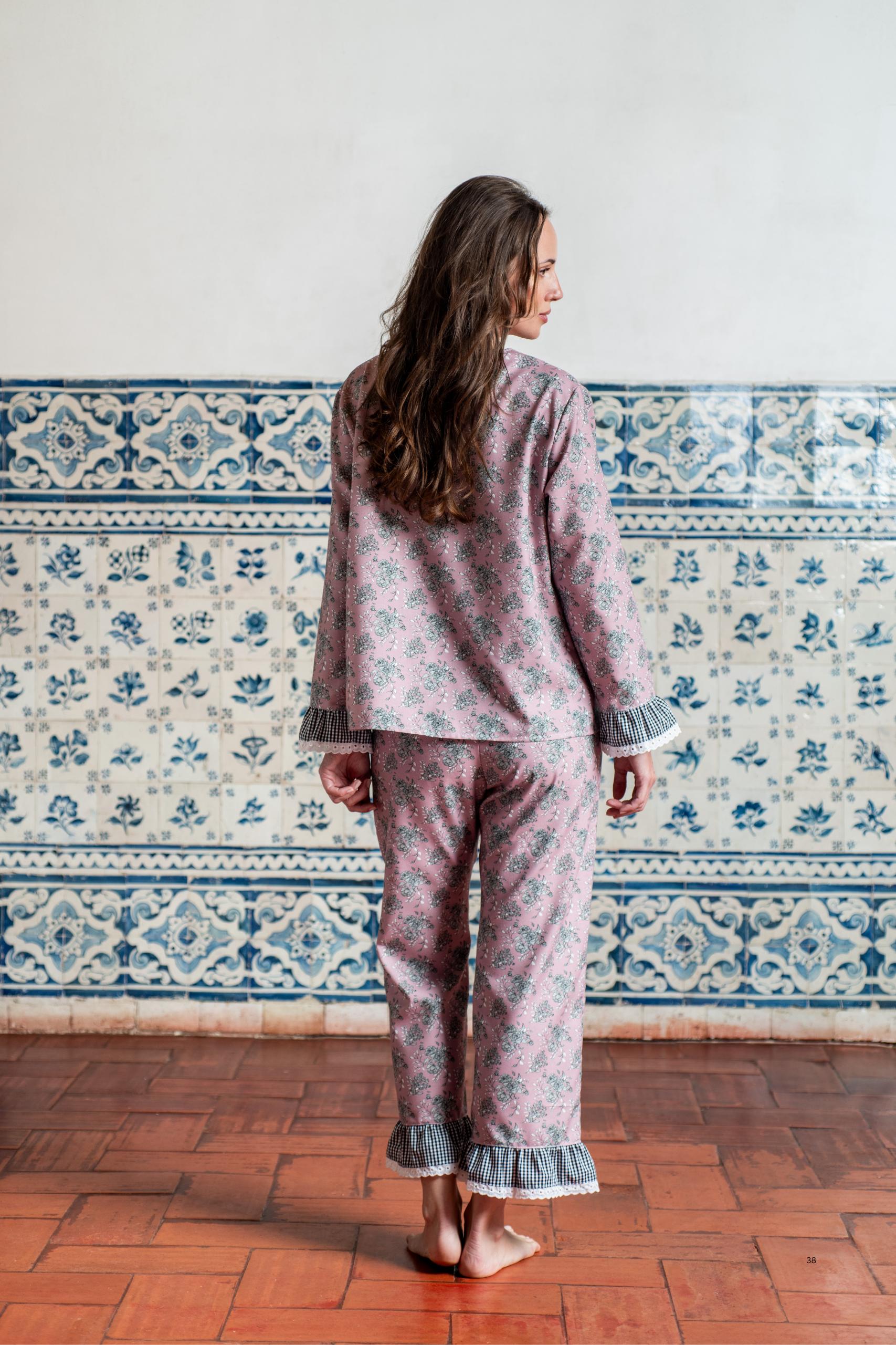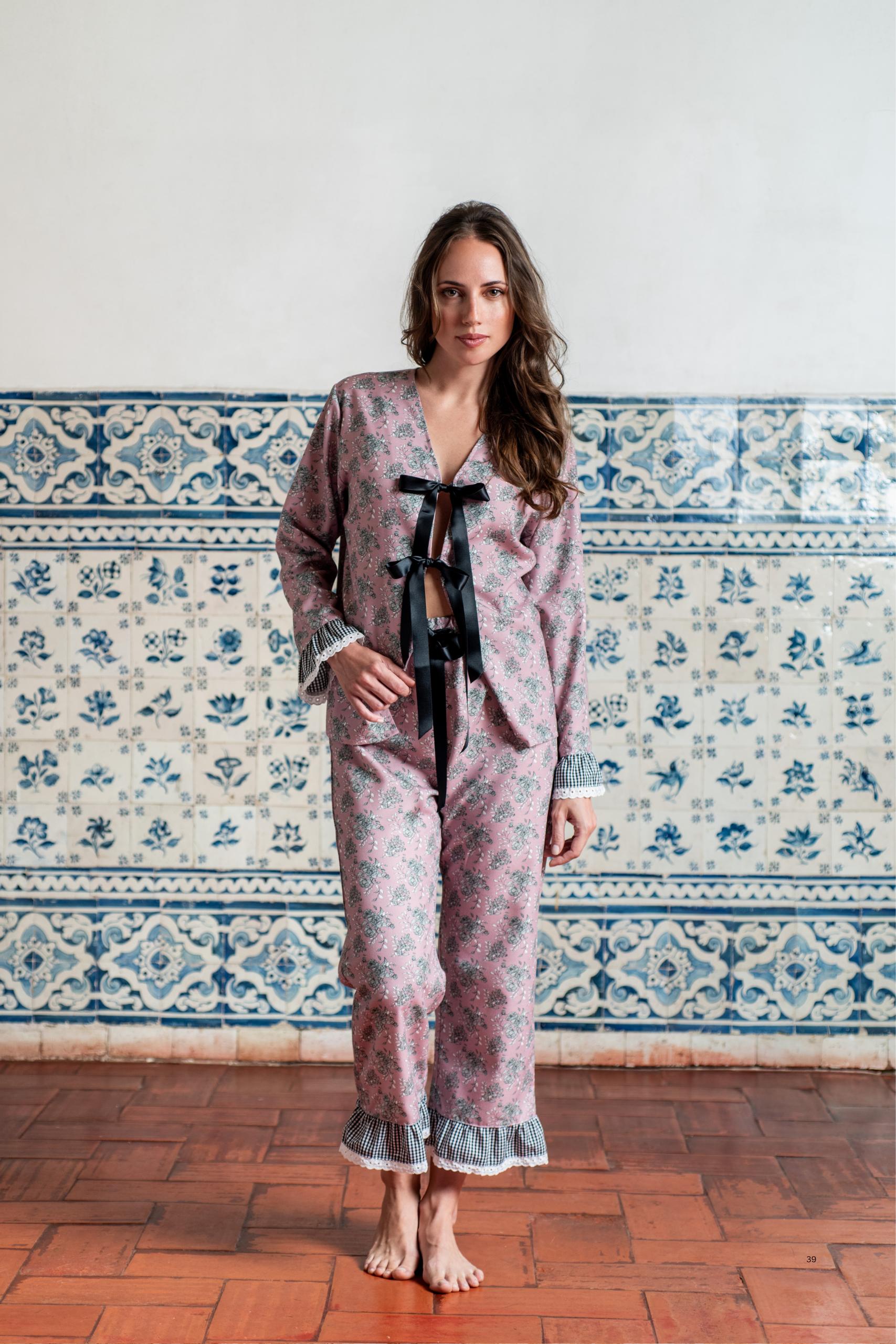 Romantic and timeless, the Luzia Long Pyjama Set blends warmth, femininity, and charm. Crafted from 100% cotton viyela, a soft brushed fabric perfect for winter, it wraps you in comfort while retaining an elegant silhouette. A delicate floral print in pink, grey, and off-white, lightly outlined in black, adds subtle sophistication. Cropped trousers and refined frill details create a playful yet graceful design — ideal for cozy moments at home, whether for sleep or slow lounging.
