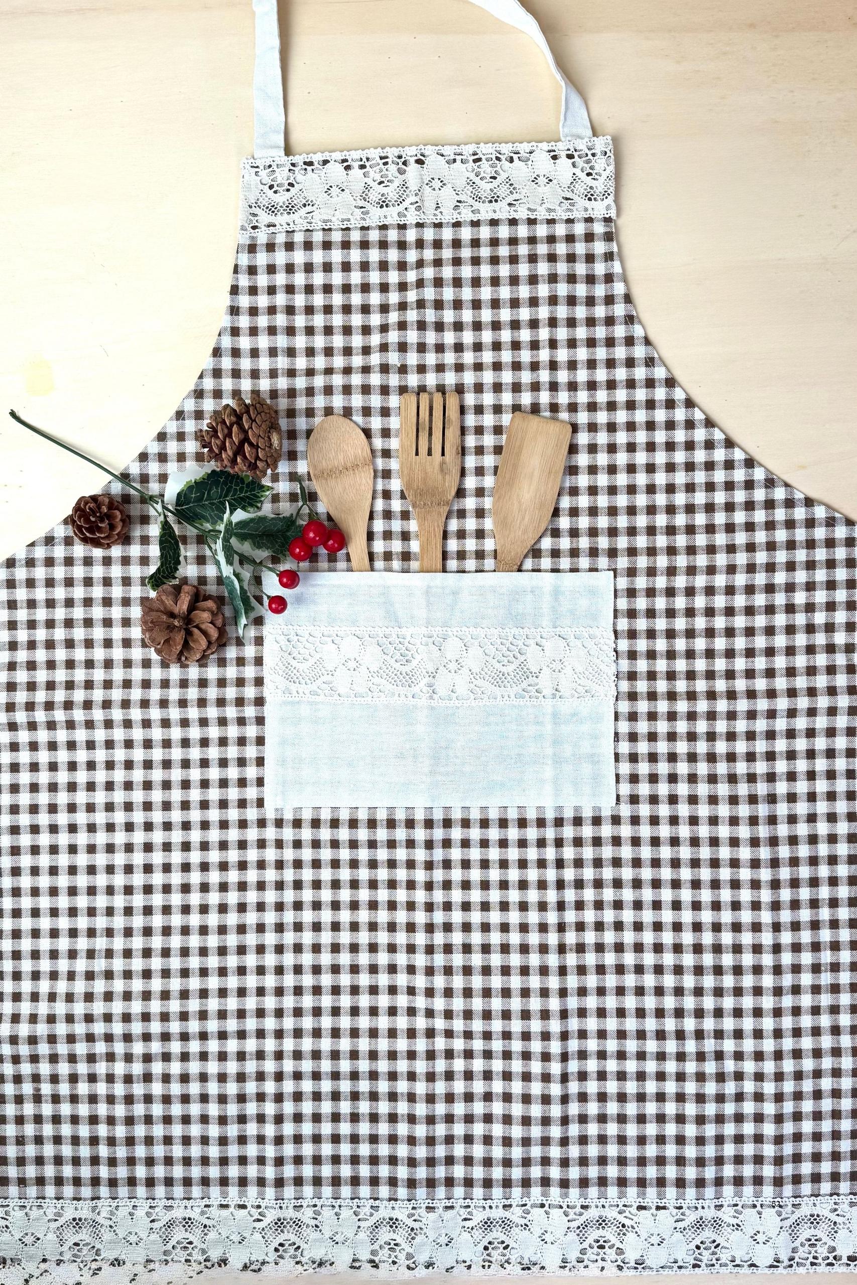 Infuse your kitchen with charm and nostalgia with our Vichy Brown Apron — a graceful blend of earthy brown hues and classic vichy checks, beautifully finished with delicate lace accents for a touch of timeless romance.