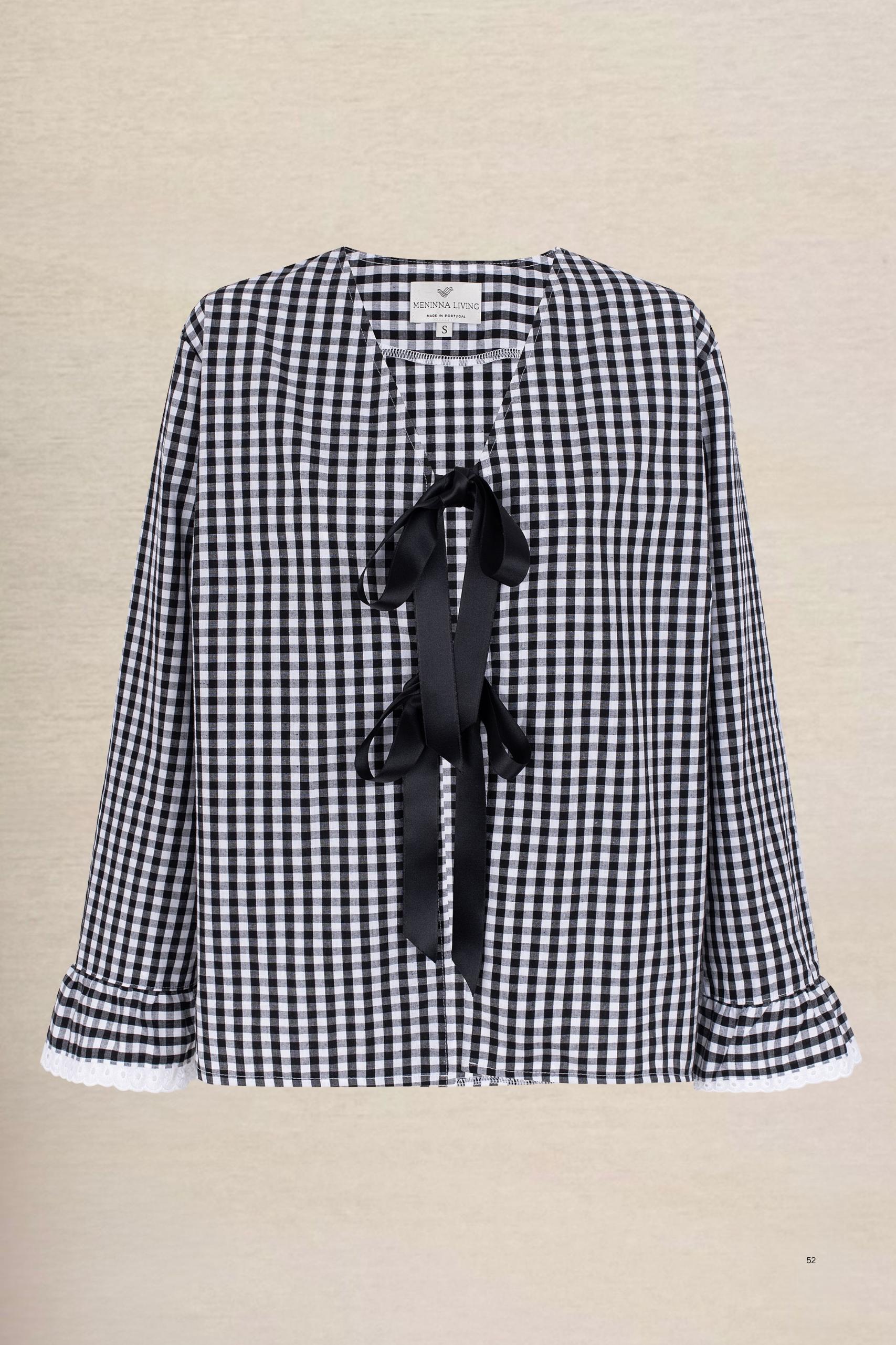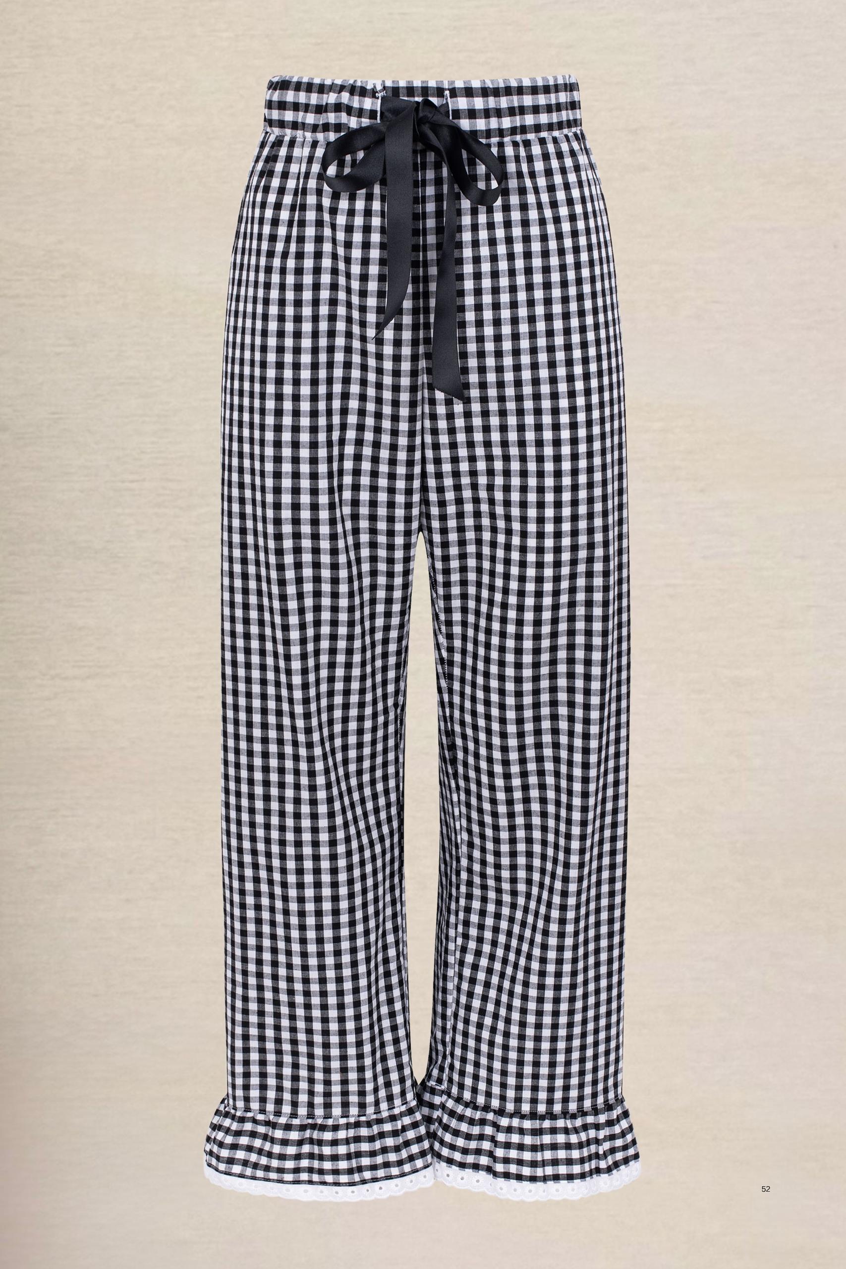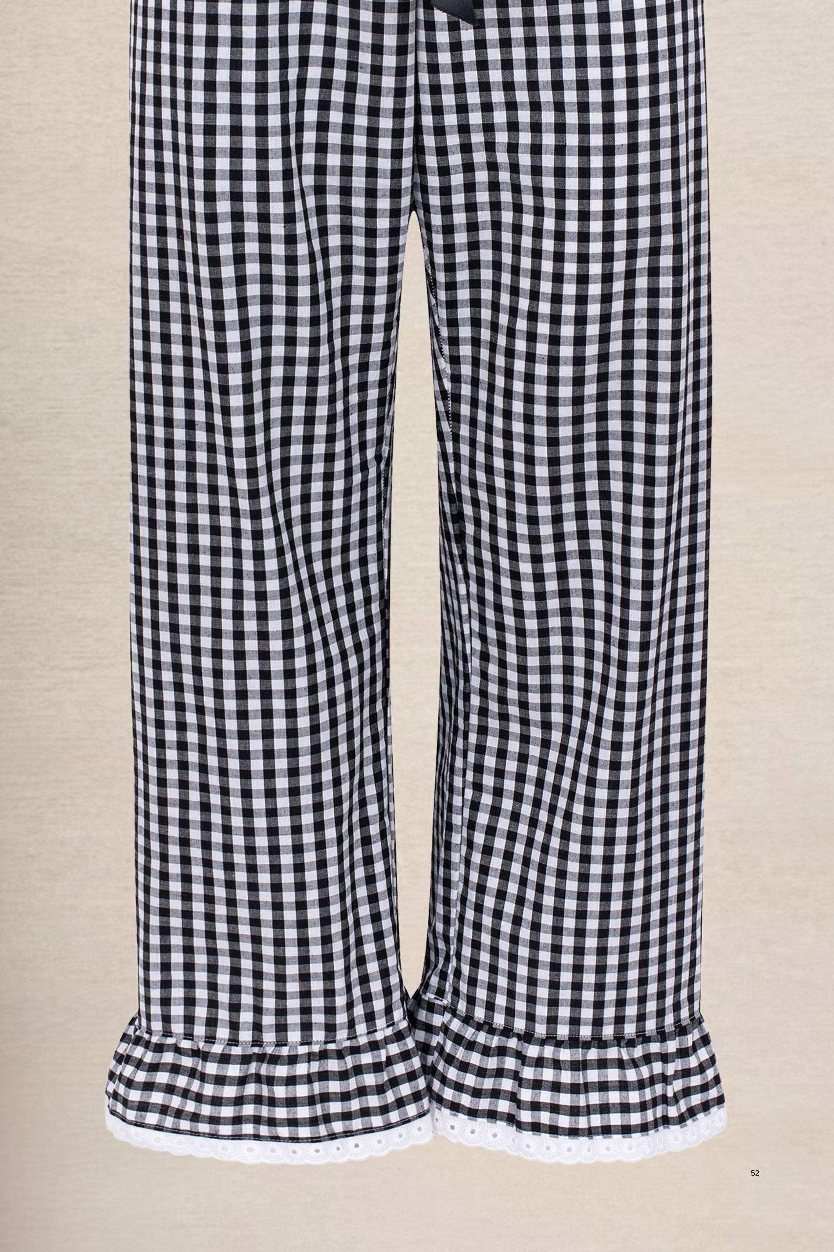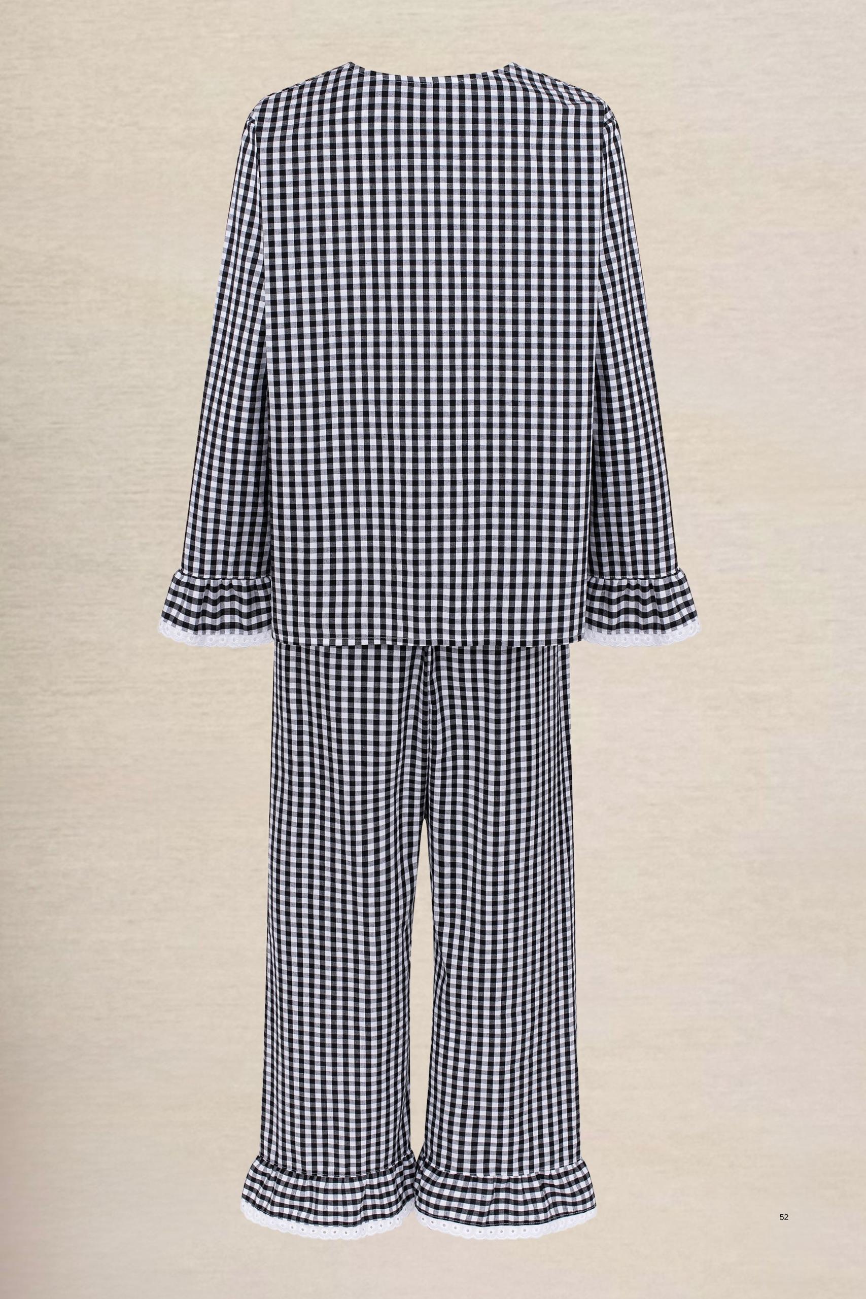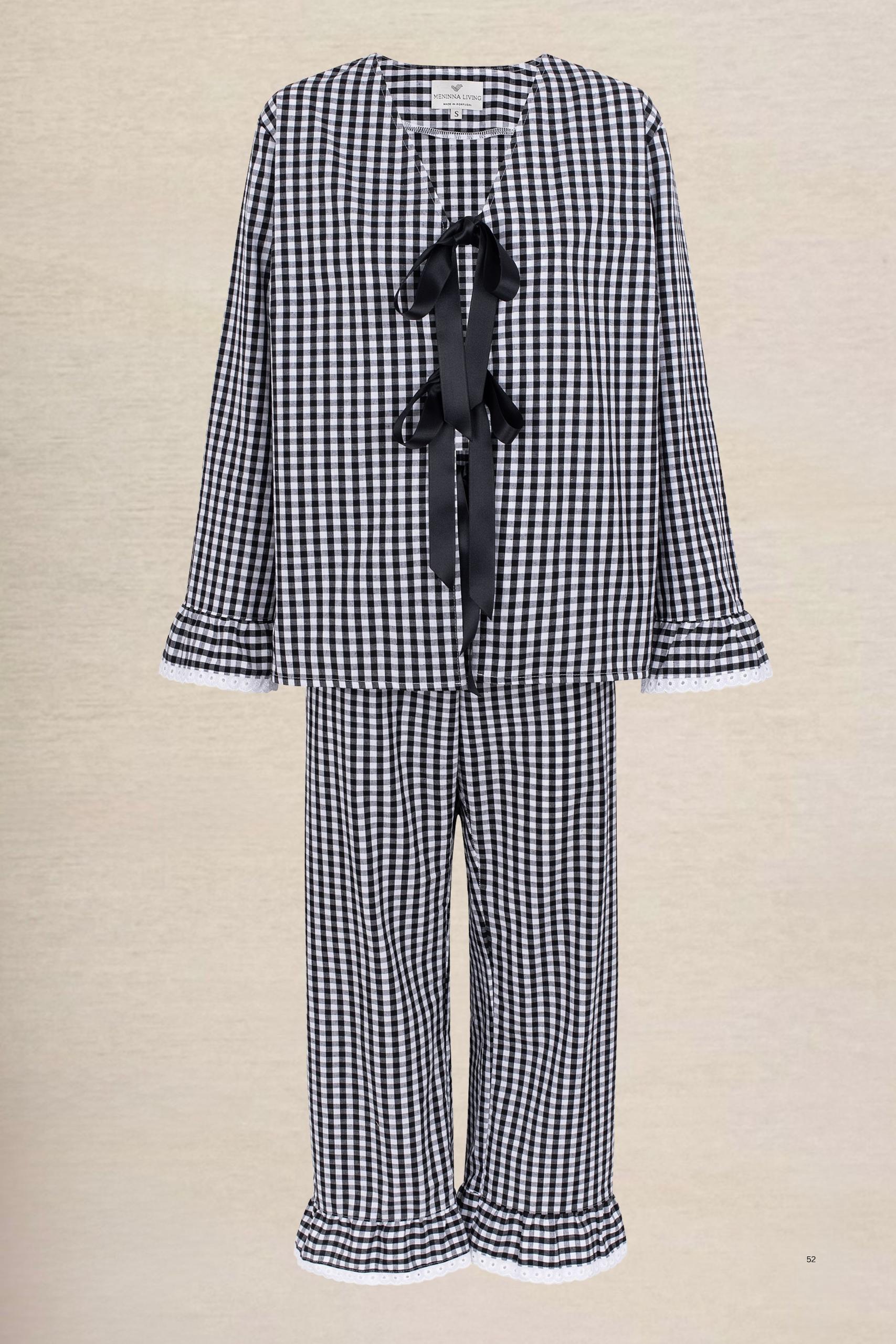 The Vichy Long Pyjama Set in classic black and white combines vintage charm with modern comfort. Featuring lace-trimmed sleeves and hems, delicate black bows, and a relaxed fit, this romantic set is perfect for cozy nights or stylish lounging.