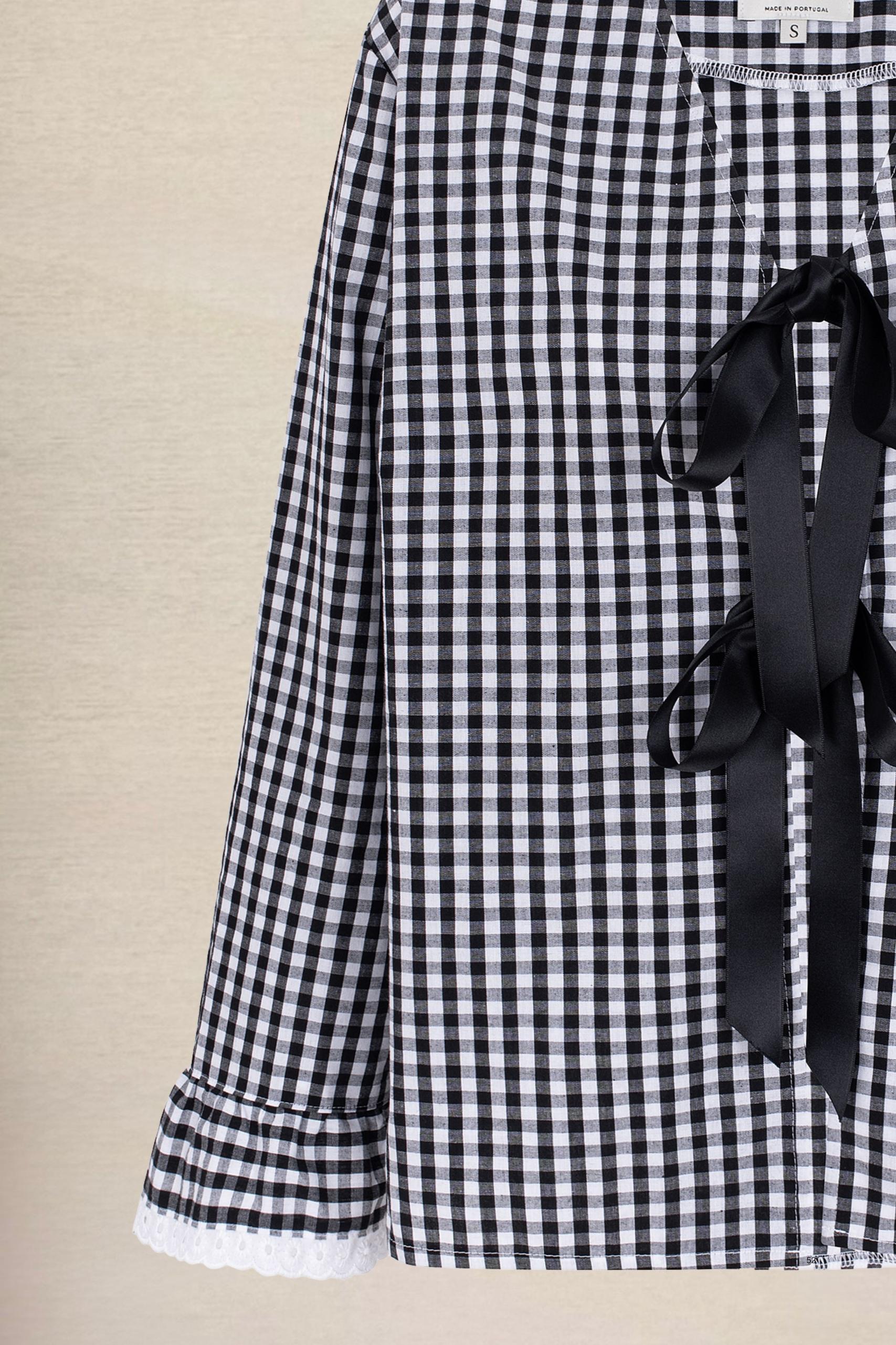 Embrace comfort and elegance with the Vichy Long Pyjama Set in classic black and white. Crafted from soft, breathable 100% cotton fabric, this romantic set blends vintage charm with everyday coziness. The long-sleeve top is adorned with delicate lace at the cuffs and finished with charming black bows, while the matching trousers feature a coordinating bow and lace-trimmed hems for a refined touch.